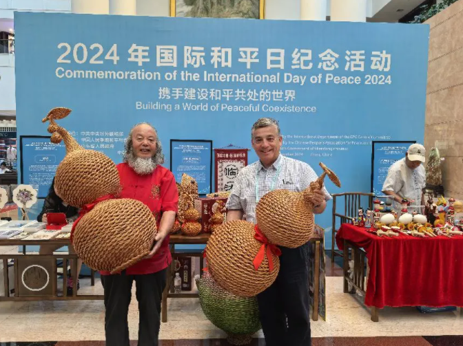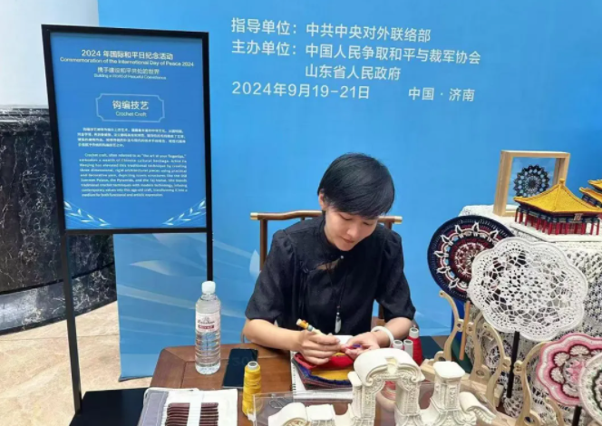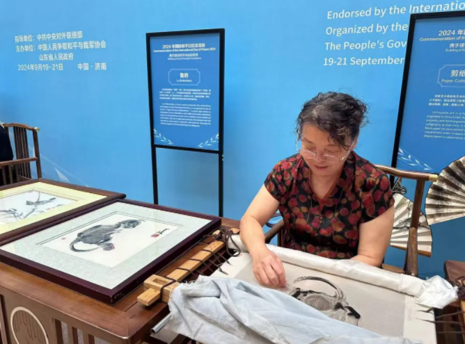 9月19日,由中国人民争取和平与裁军协会和山东省人民政府合作举办的2024年国际和平日纪念活动在济南开幕。外国政党政要、和平友好组织、安全智库代表和国内相关部门代表约180人参会。山东省文化和旅游厅组织剪影、鲁绣、临沭柳编、郯城木旋玩具、聂家庄泥塑、蜡线编织、盘扣、盘纸等8个非遗项目及传承人参与活动,进行展览展示,呈现山东非遗独特魅力,展现中华优秀传统文化底蕴。