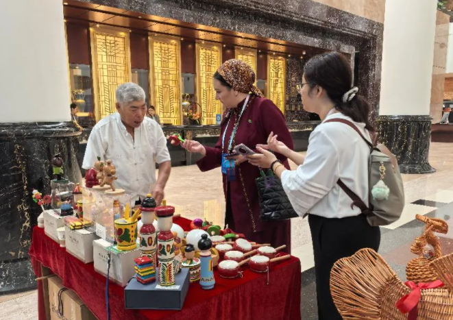 郯城木旋玩具因其大多数部件在旋床上旋制而得名,已有500余年历史,是国家级非遗项目。项目代表性传承人樊继美带来众多色彩丰富、纹饰夸张的传统玩具,吸引了许多嘉宾的注意力,引来阵阵欢笑。樊继美向来自土库曼斯坦的嘉宾赠送了两个木旋玩具。嘉宾表示,自己有两个孩子,他们收到来自中国的礼物一定特别高兴。
