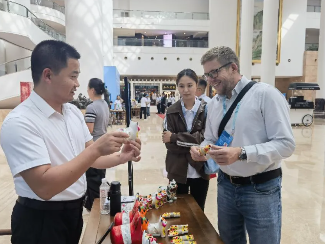 聂家庄泥塑起源于明朝万历年间,至今已有400余年的历史,是国家级非遗项目。与其他泥塑不同,聂家庄泥塑具有“形、色、声、动”四大独特效果,制成的泥娃娃、叫虎、叫鸡、摇猴特色鲜明,颜色亮丽,好看又好玩。项目代表性传承人聂鹏在活动现场为嘉宾展示中国传统泥塑玩具,吸引嘉宾驻足欣赏。他还为老挝嘉宾赠送泥塑作品留作纪念,展现山东热情好客之情。